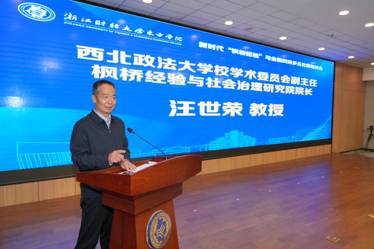 童志锋代表学院向与会嘉宾致以诚挚欢迎!他表示,“枫桥经验”蕴含的“党的领导、群众路线、三治融合”核心内涵,为金融纠纷多元化解工作提供了根本遵循。当前金融纠纷呈现类型多样、专业性强、化解难度大,亟需依托新时代“枫桥经验”整合资源、完善联动机制,推动纠纷化解从“终端处置”向“源头防控”、从“单一化解”向“多元协同”转变,此次研讨会正是为破解实践难点、推动“枫桥经验”在金融领域落地见效而举办。他强调,东方学院作为培养高素质人才、开展学术研究与社会服务的重要阵地,始终立足时代需求,主动担当社会责任,将法治教育、金融素养培育与社会治理实践紧密结合,积极搭建学术交流平台,汇聚多领域专家力量,探索金融纠纷多元化解新模式,为金融领域基层治理现代化贡献智慧。