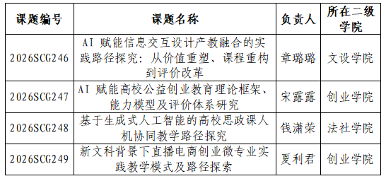 根据《浙江省教育科学规划领导小组办公室关于公布2026年浙江省教育科学规划课题立项名单的通知》(浙教科规办〔2026〕01号),我院共立项4项,现予以公布。