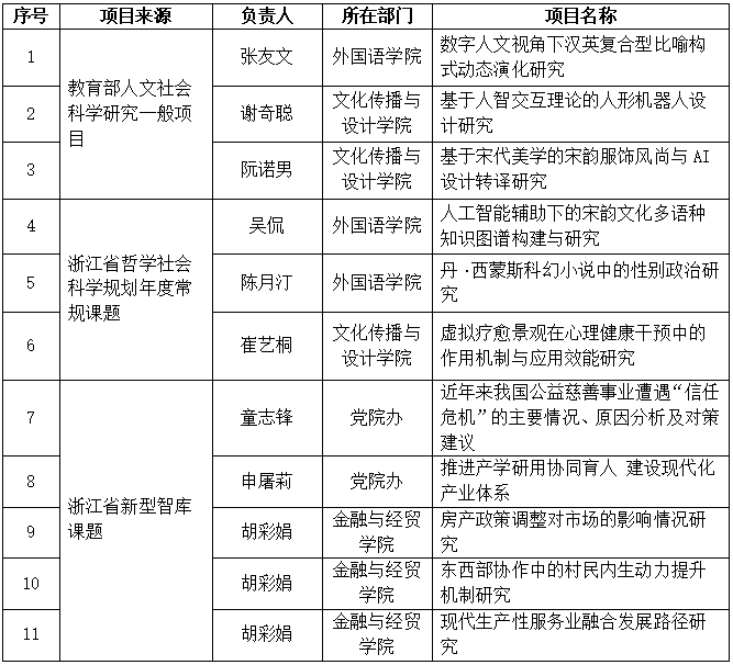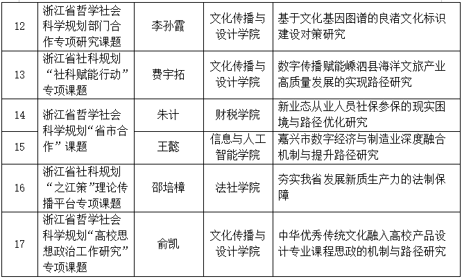 近日,教育部社科司和浙江省哲学社会科学工作办公室分别公布了教育部人文社科研究一般项目评审结果、浙江省哲学社会科学规划课题等各类省部级课题的立项名单,学院喜获17项课题立项,其中教育部人文社科研究一般项目3项,浙江省哲学社会科学规划课题3项,浙江省新型智库课题项目5项(其中重点1项),浙江省哲学社会科学规划部门合作专项研究课题1项,浙江省社科规划“社科赋能行动”专项课题1项,浙江省哲学社会科学规划“省市合作”课题2项,浙江省社科规划“之江策”理论传播平台专项课题1项,浙江省哲学社会科学规划“高校思想政治工作研究”专项课题1项,立项数量再创佳绩。